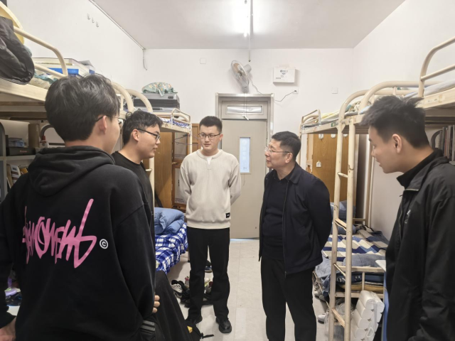 走访过程中,王炜明与同学们亲切交流,细致询问大家的学习进度与生活近况,叮嘱同学们要保持良好的作息规律,始终将身体健康放在首位,合理安排学习与休息时间,保持积极向上的精神面貌。他特别强调,学生干部要发挥模范带头作用,主动关心身边同学,带动宿舍形成自律奋进、互助友爱的良好氛围。王炜明希望同学们珍惜大好时光,在奋斗中释放青春激情、追逐青春理想,既要扎实学好专业知识,也要积极参与校园文体活动,在实践中锤炼本领、增长才干,以强健的体魄和饱满的热情迎接成长路上的挑战。同时,冯昌顺也对宿舍安全、卫生等工作进行叮嘱,提醒同学们注意用电安全,保持宿舍整洁,共同营造安全、舒适、文明的居住环境。